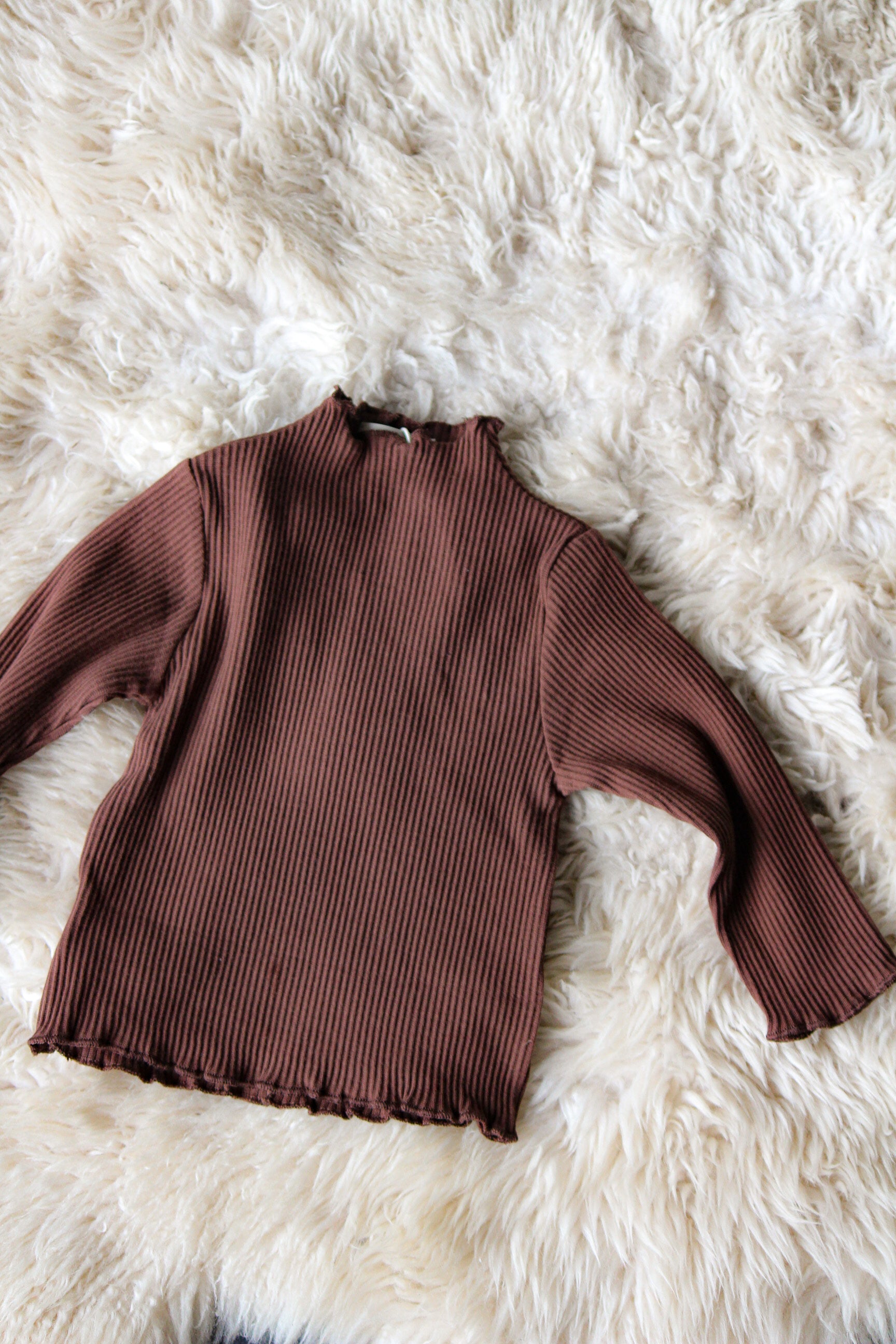 Our Ribbed Frill Neck Long Sleeve is a cozy staple with elevated details. Made from a soft, high-quality ribbed fabric in a rich dark brown, this top is incredibly stretchy and comfortable for everyday wear. The higher neckline is finished with a delicate frill detail, adding a sweet, timeless touch.