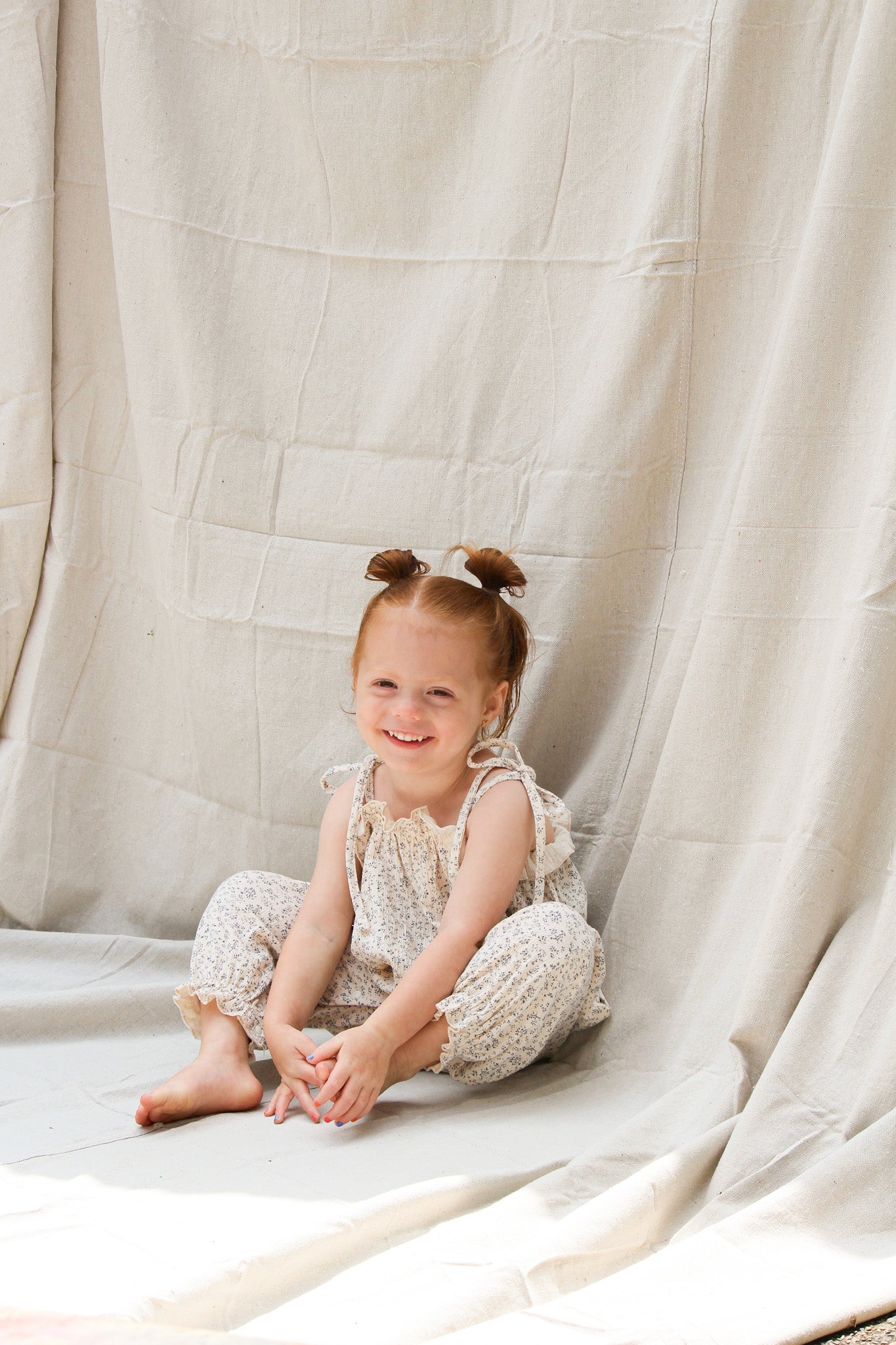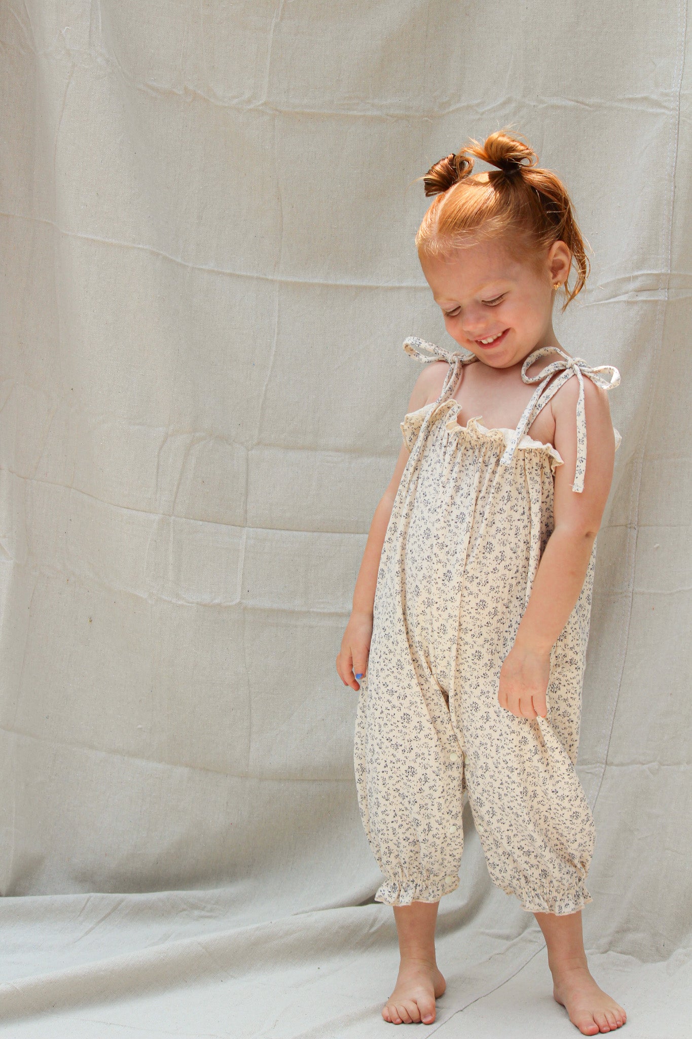 Say hello to the Dolly June Jumpsuit — a sweet nod to days spent chasing butterflies and picking wildflowers. With its delicate floral print, ruffled neckline, and adjustable tie straps, this piece brings all the charm of a slow summer morning. The gathered hems give it a timeless, vintage silhouette that’s perfect for barefoot play and golden hour giggles.