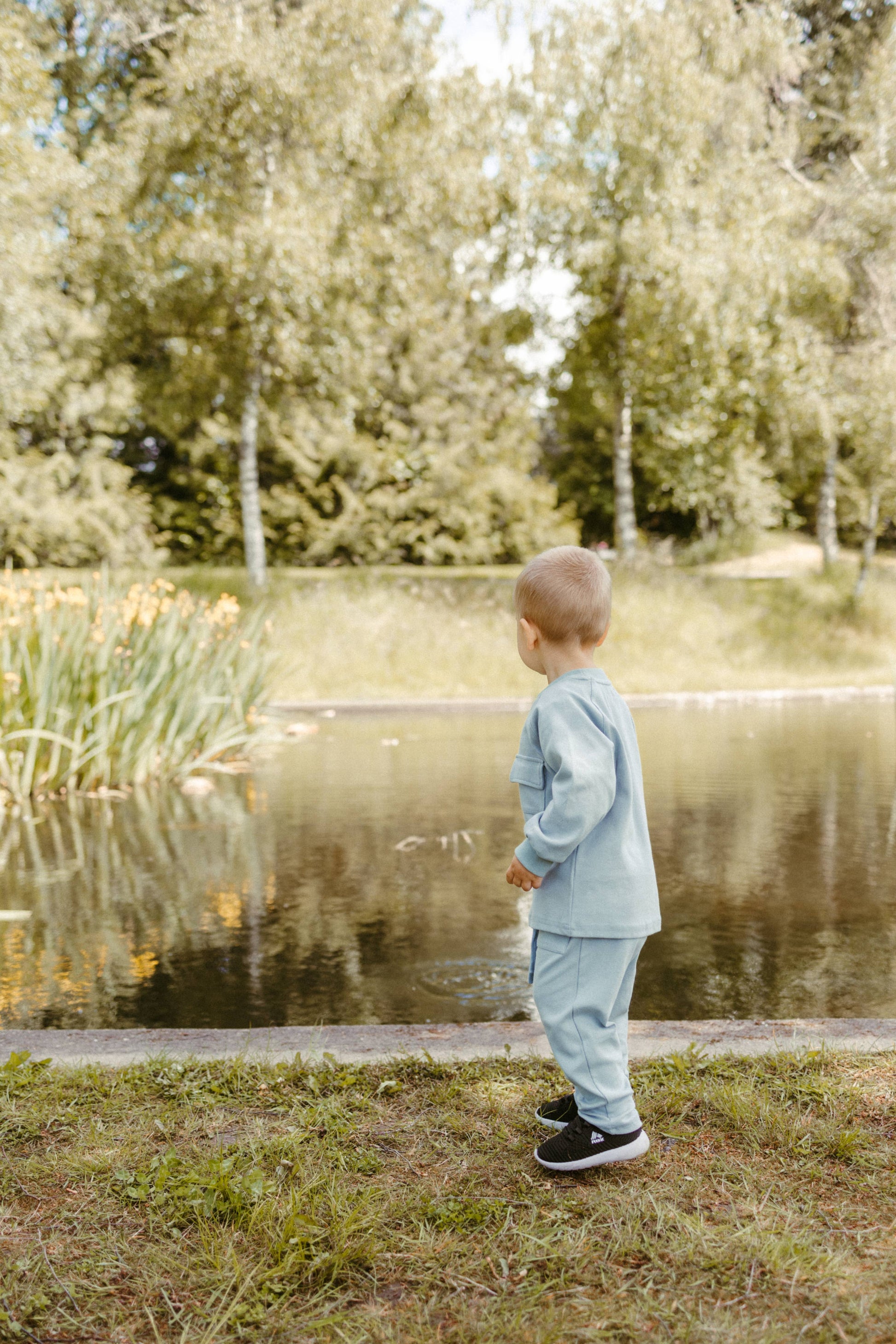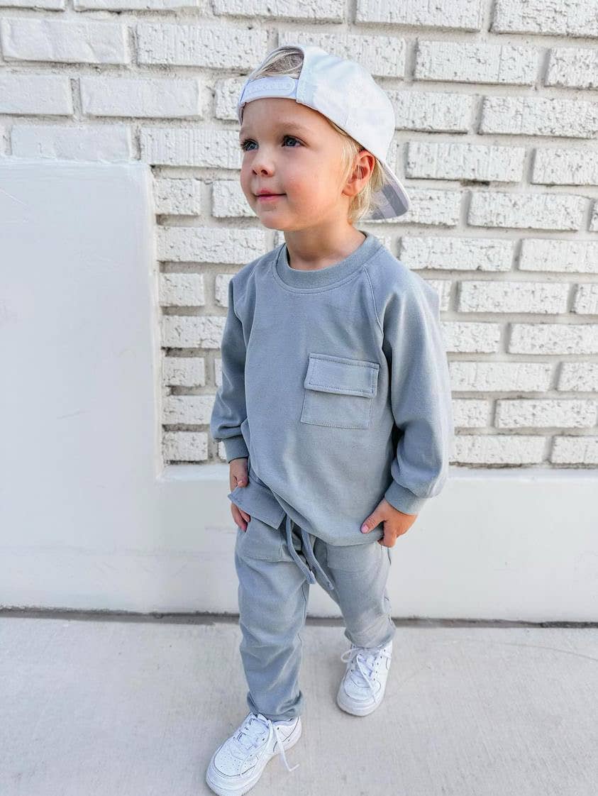 This Raglan Playwear Set in Dusty Blue is made of super soft cotton and designed for a gender neutral, oversized fit. It features a high quality, long sleeve raglan top and jogger style pants with square pockets and oversized fit.