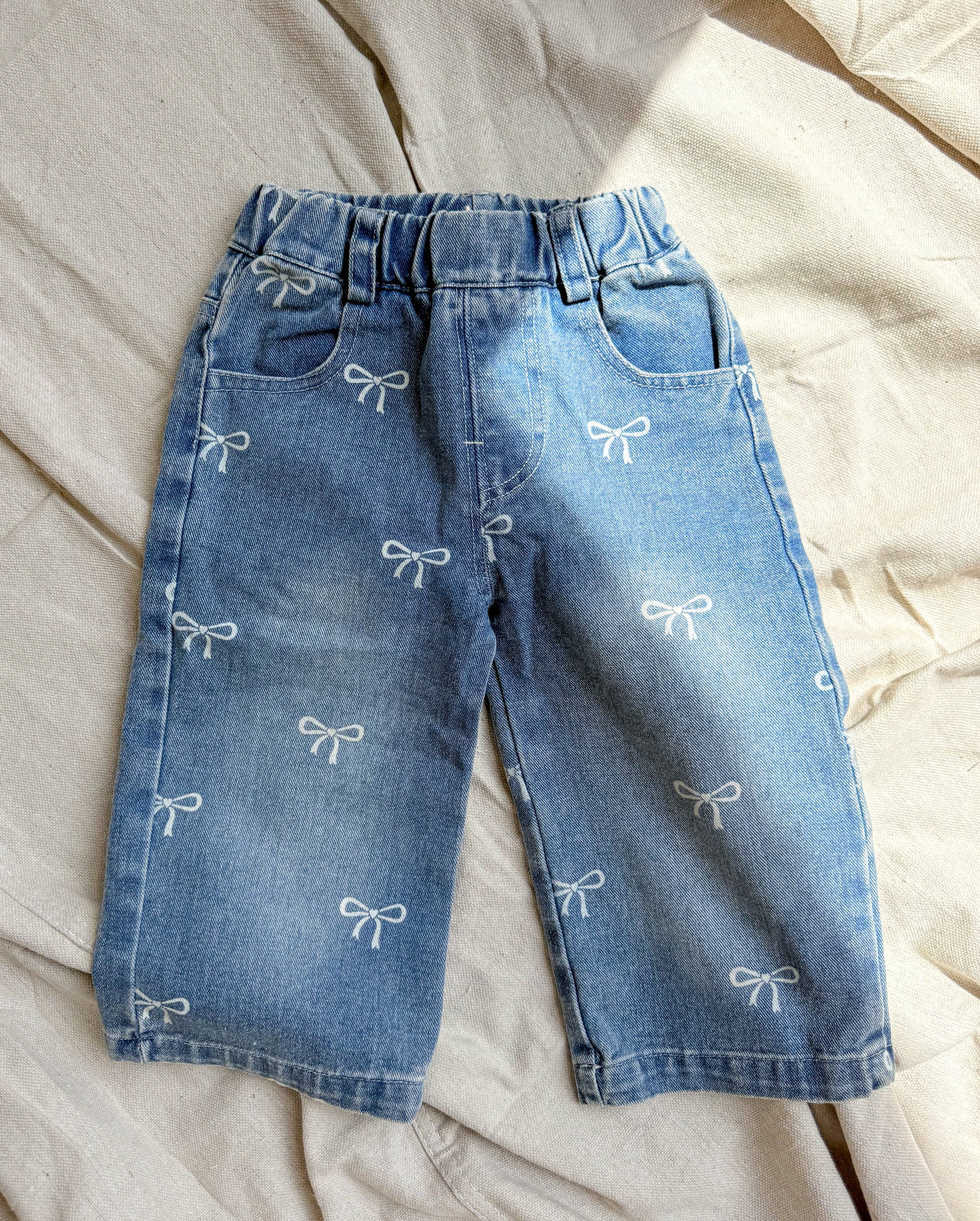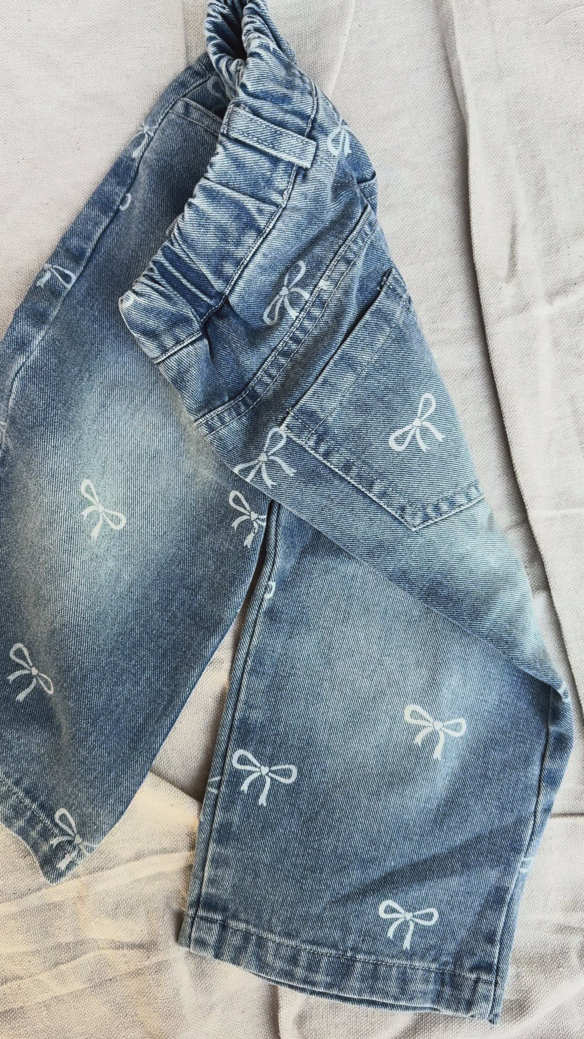 A playful twist on a classic — these soft-washed denim pants are sprinkled with tiny white bow prints for the sweetest little statement. Designed with comfort in mind, they feature an elastic waist and relaxed fit perfect for playdates, errands, and everything in between. Pair with a fluttery top or cozy knit for an outfit that’s effortlessly cute