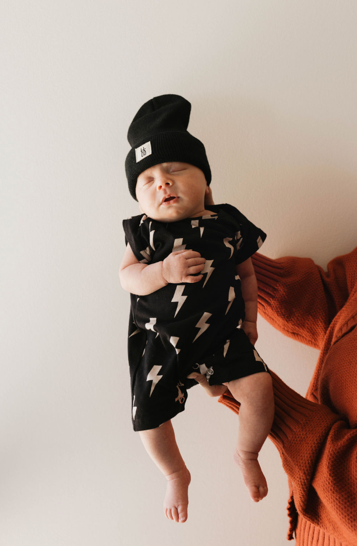 Light up your little one's wardrobe with our Black & Tan Lightning Bolt T-Shirt Romper! Featuring a bold lightning bolt design on a black background, this romper is perfect for babies aged 0-24 months. Plus, with convenient snaps for easy diaper changes, it's both stylish and practical. Add a spark of energy to your baby's outfit today!